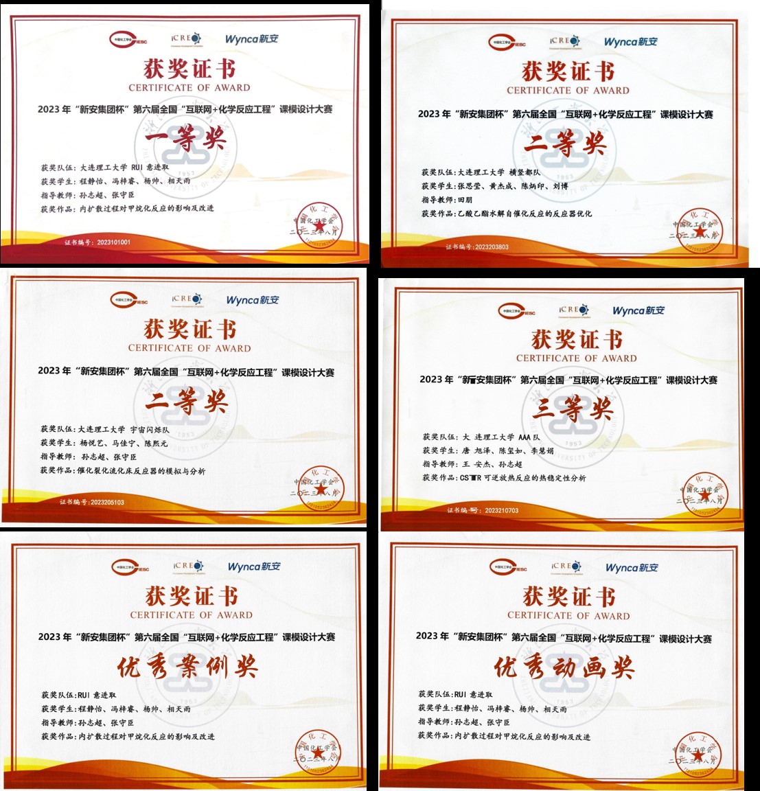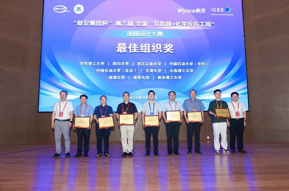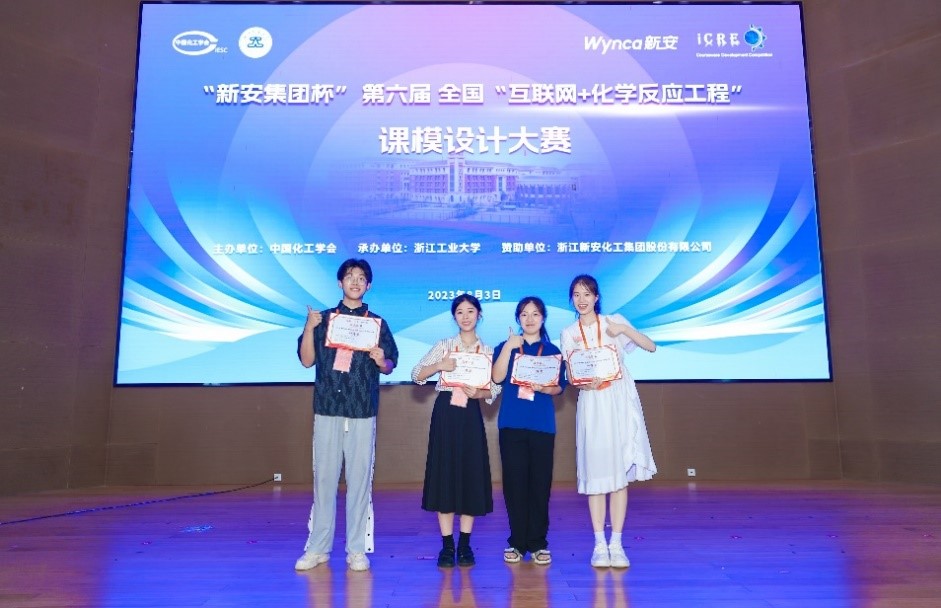 2023年8月3日,由中国化工学会主办,浙江工业大学承办的"新安集团杯”第六届全国"互联网+化学反应工程”课模设计大赛落下帷幕。竞赛于2023年5月至8月举办,共有来自26个省市自治区、76高等院校、447支队伍报名参加,经过专家初评、终评和会议评审等程序,评出作品奖项137项(一等奖20项、二等奖40项、三等奖77项),优秀案例奖3项,优秀动画奖5项,最佳组织奖10所学校,优秀指导教师8名。本届比赛是历届参赛作品数量最多、作品水平最高的一届。我校有四支队伍在强手如林的参赛队伍中脱颖而出获得佳绩,共获得一等奖1项、二等奖2项、三等奖1项、优秀案例奖1项、优秀动画奖1项,同时我校还获得了最佳组织奖。