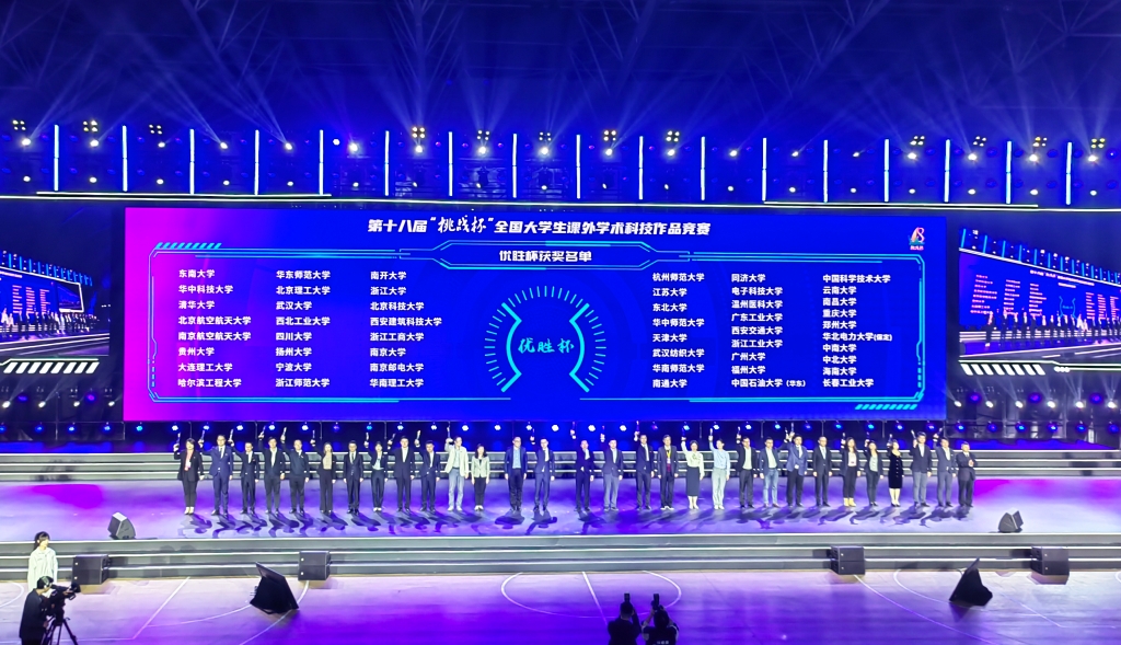 10月30日晚,第十八届“挑战杯”全国大学生课外学术科技作品竞赛终审决赛在贵州大学落幕。经过激烈角逐,我校代表团斩获主体赛特等奖1项、一等奖4项、二等奖1项以及此前的“揭榜挂帅”专项赛特等奖2项、一等奖3项、二等奖1项、三等奖1项,以团体总分第8名再度捧起“优胜杯”,创我校在“挑战杯”赛事上的获奖数量历史最多、获奖等级历史最高、全国排位历史最佳。