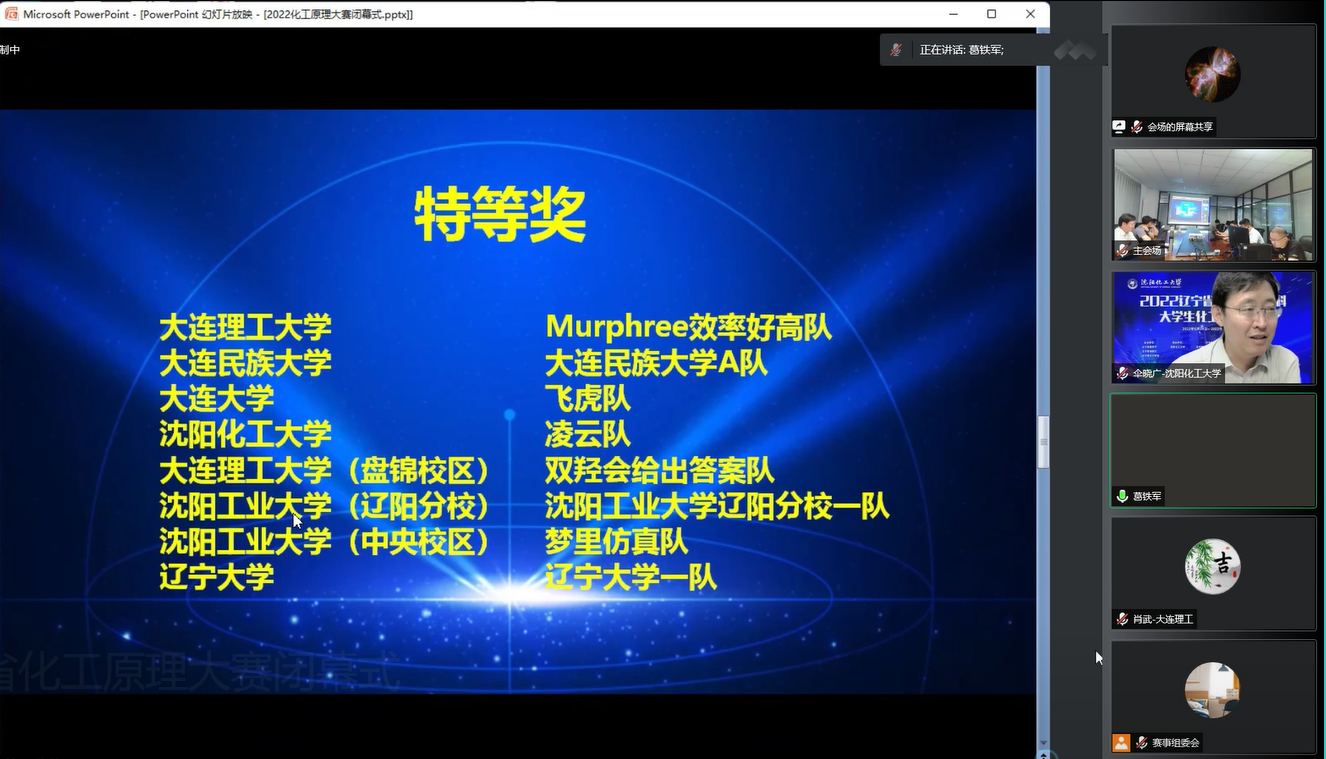 2022年6月24至26日,由辽宁省教育厅、辽宁省财政厅和辽宁省化工学会主办,沈阳化工大学承办的2022年辽宁省普通高等学校本科生大学生化工原理大赛在辽宁沈阳成功举办,辽宁省内的20所高校的40支队伍参加比赛。我校化工学院选派的主校区Murphree效率好高队(詹汪琳、成兆淑、宁方瑞)、盘锦分院双羟会给出答案队(田力、张倩、李文博)均以优异成绩获得2022年辽宁省普通高等学校本科生大学生化工原理大赛特等奖。另外主校区单元操作队(杨铭、弓泽宇、梁欣)和盘锦分院化都队(陈缘、徐若竹、段叶菲)获得2022年辽宁省普通高等学校本科生大学生化工原理大赛一等奖。