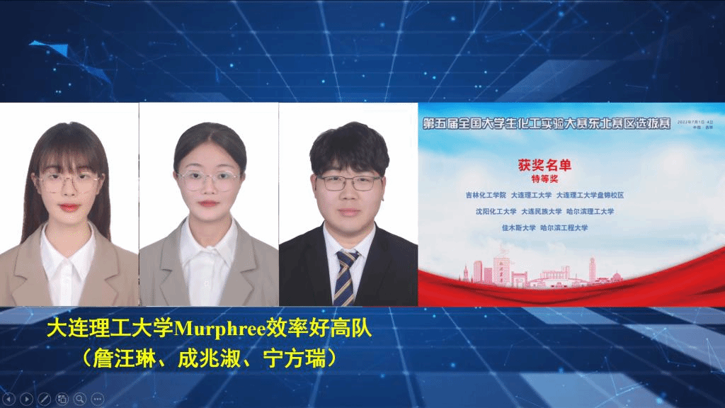 2022年7月1日至4日,由教育部高等学校化工类专业教学指导委员会、中国化工教育协会主办,吉林化工学院承办的第五届全国大学生化工实验大赛东北赛区选拔赛,在吉林市成功举办。来自东北地区的34支队伍参加比赛。我校化工学院选派的Murphree效率好高队(詹汪琳、成兆淑、宁方瑞)、双羟会给出答案队(田力、张倩、李文博)以优异成绩获得第五届全国大学生化工实验大赛东北赛区选拔赛特等奖。