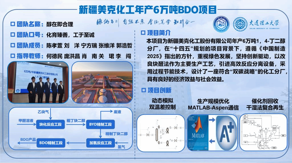 “醇在即合理”团队以乙炔、甲醛和氢气为原料,通过绿色先进的改良炔醛法工艺生产6万吨1,4-丁二醇产品,对项目进行市场调研、厂址选择、可行性论证、工艺路线比选、工艺流程确定、流程模拟、设备设计与选型、自动控制、工厂与车间平立面布置、安全评价、环境评价、经济分析、清洁生产等几大模块进行可行的工艺和工程设计,使技术提升达到“中国制造2025”中提出的低碳绿色发展指标,利用三维建模软件对作品进行多维度展示,具有“安全、环保、节能、创新、经济、可靠、实用”的特色。该设计作品体现了新时代大学生对当前化工材料行业面临限塑令背景,对可降解塑料机遇给予独特的思考。为当前同时面对“安全环保”与“双碳”目标制约下产品1,4-丁二醇绿色低碳发展提供了一种新的思路和解决方案。